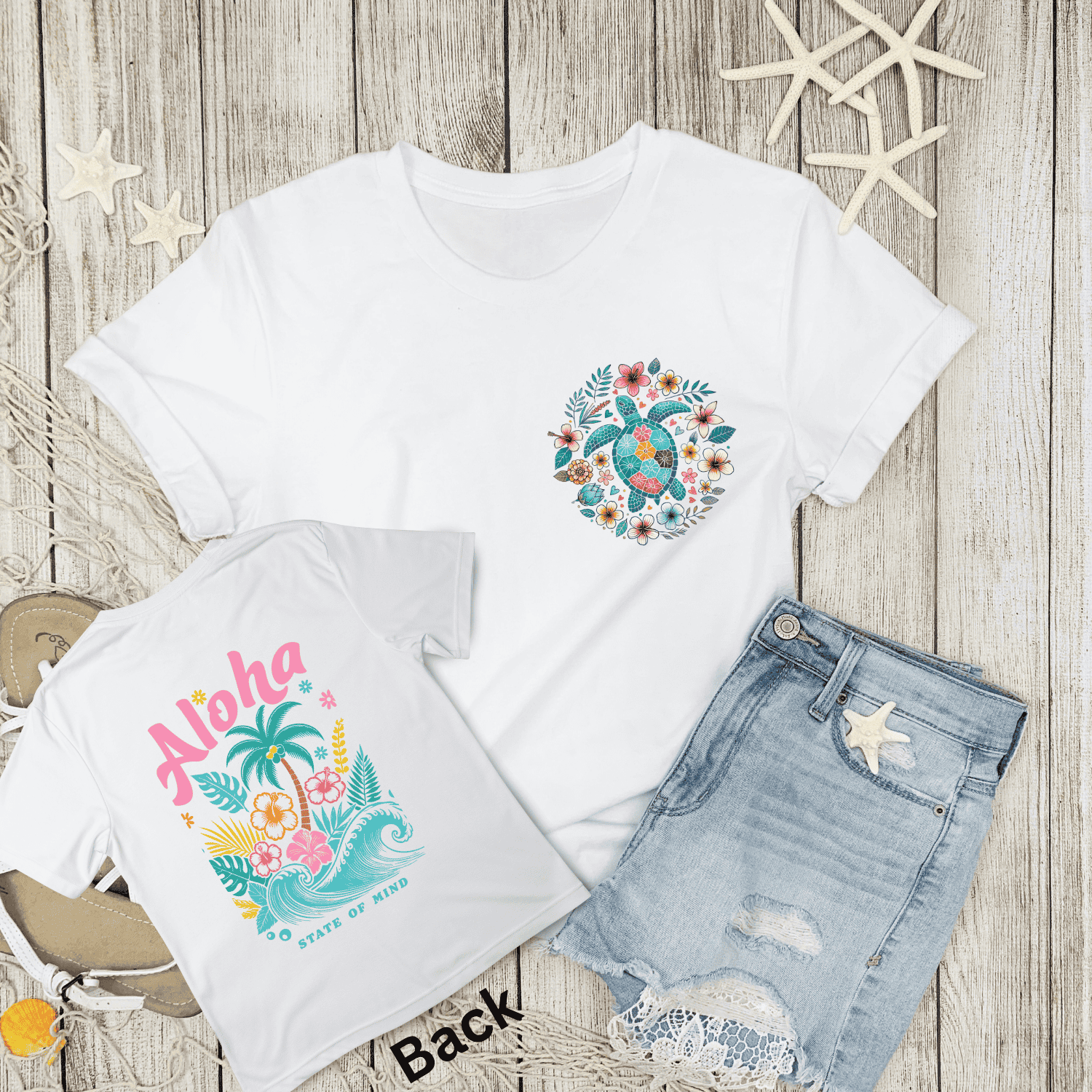 Whether you’re dreaming of sandy toes, sunny skies, or just need a little extra tropical energy in your day, this vibrant and fun tee brings beachy bliss wherever you go. Featuring an island-inspired turtle floral design on the front and a bold “Aloha State of Mind” graphic on the back, this shirt is perfect for summer outings, vacations, or anyone who loves that laid-back, ocean-loving lifestyle.