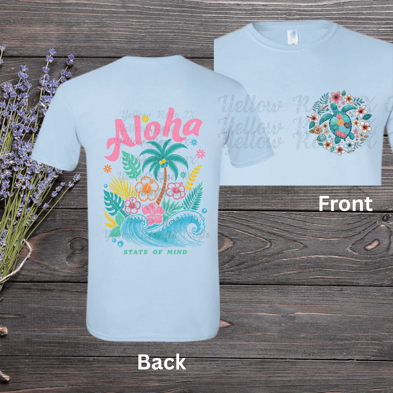 Bring on the sunshine and good vibes! Add this “Aloha State of Mind” tee to your cart and bring the beach wherever you go!