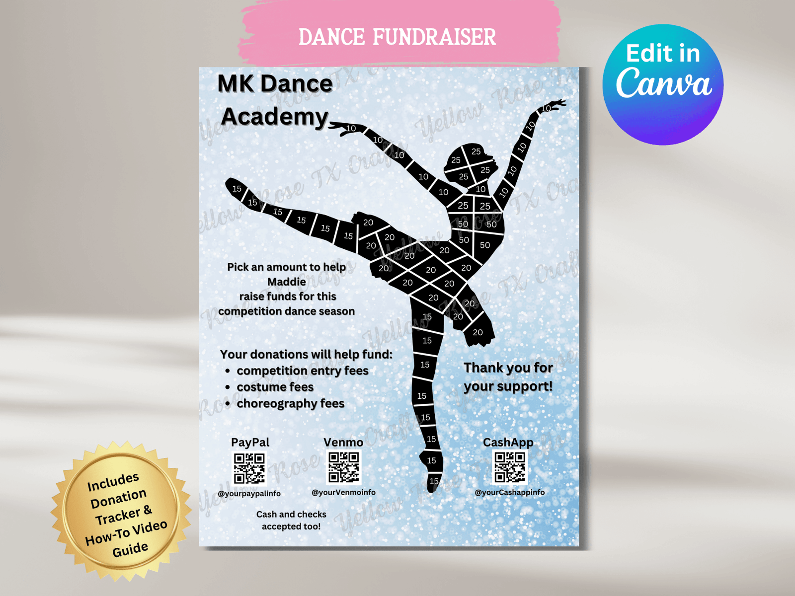 Share your customized flyer on social media to boost visibility and donations for your dancer. Thank you for choosing our template to support your fundraising journey!