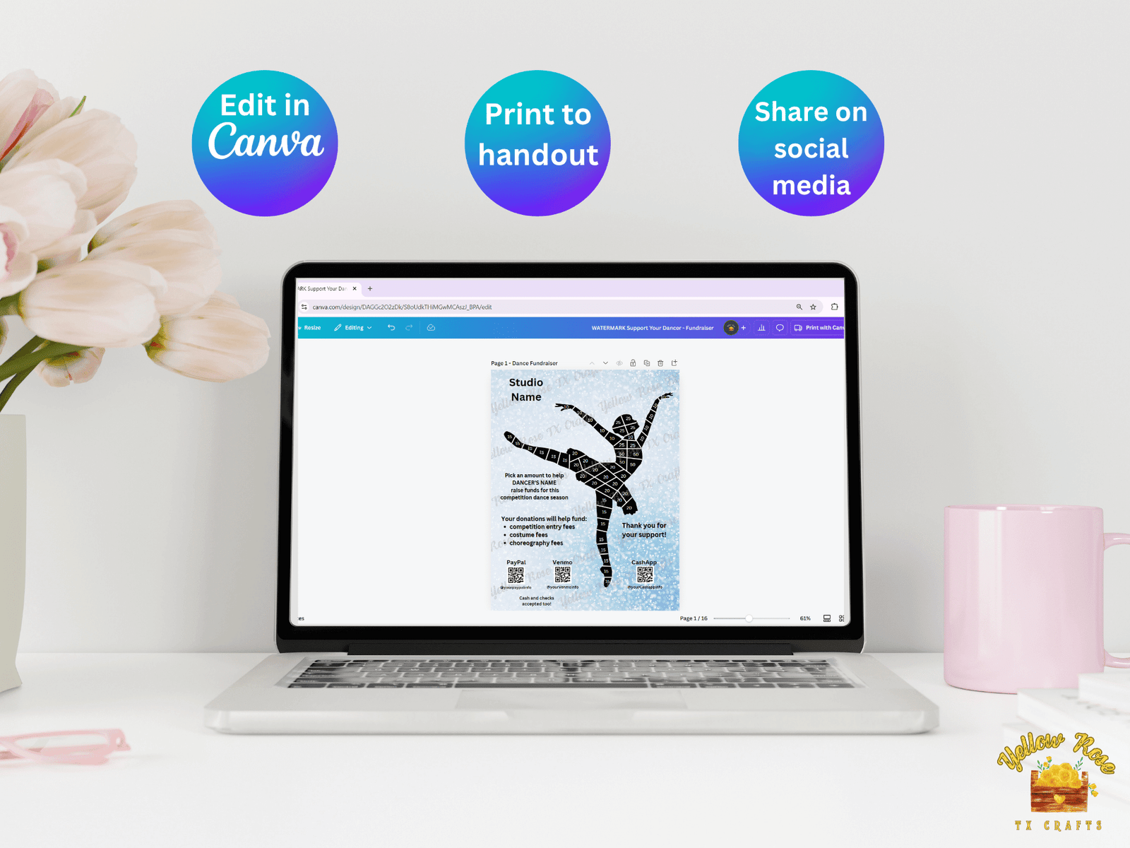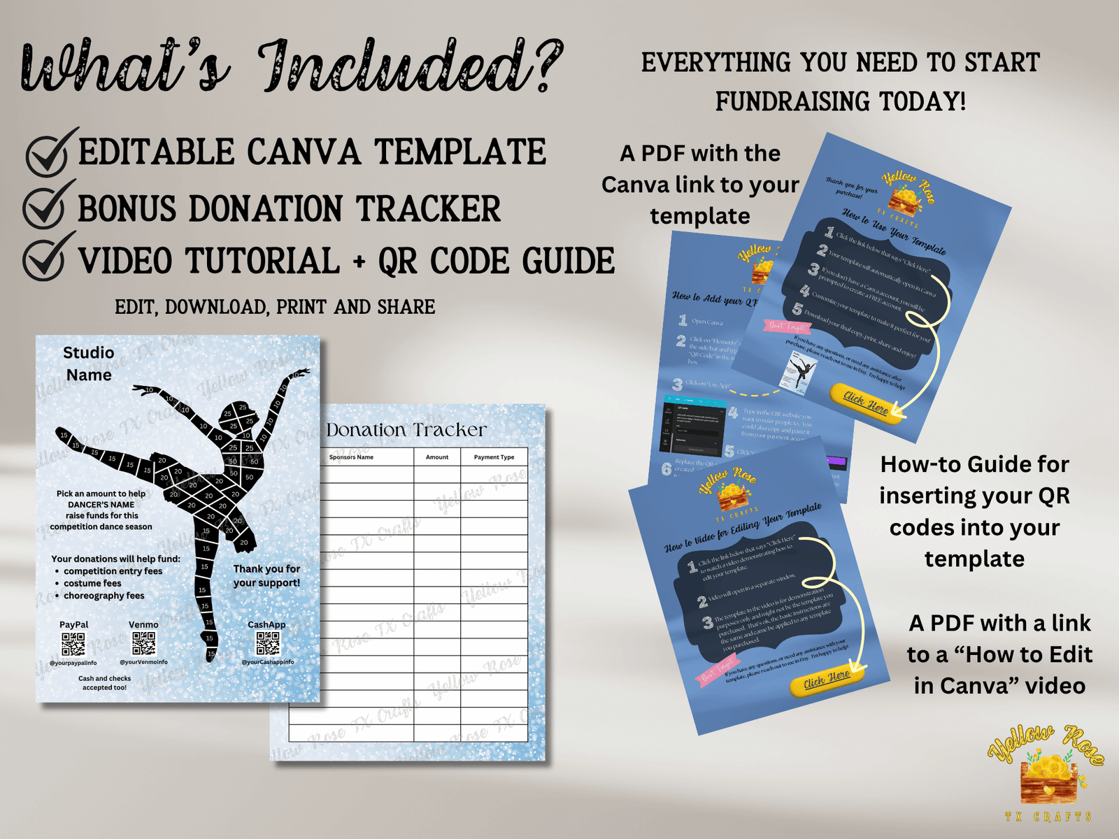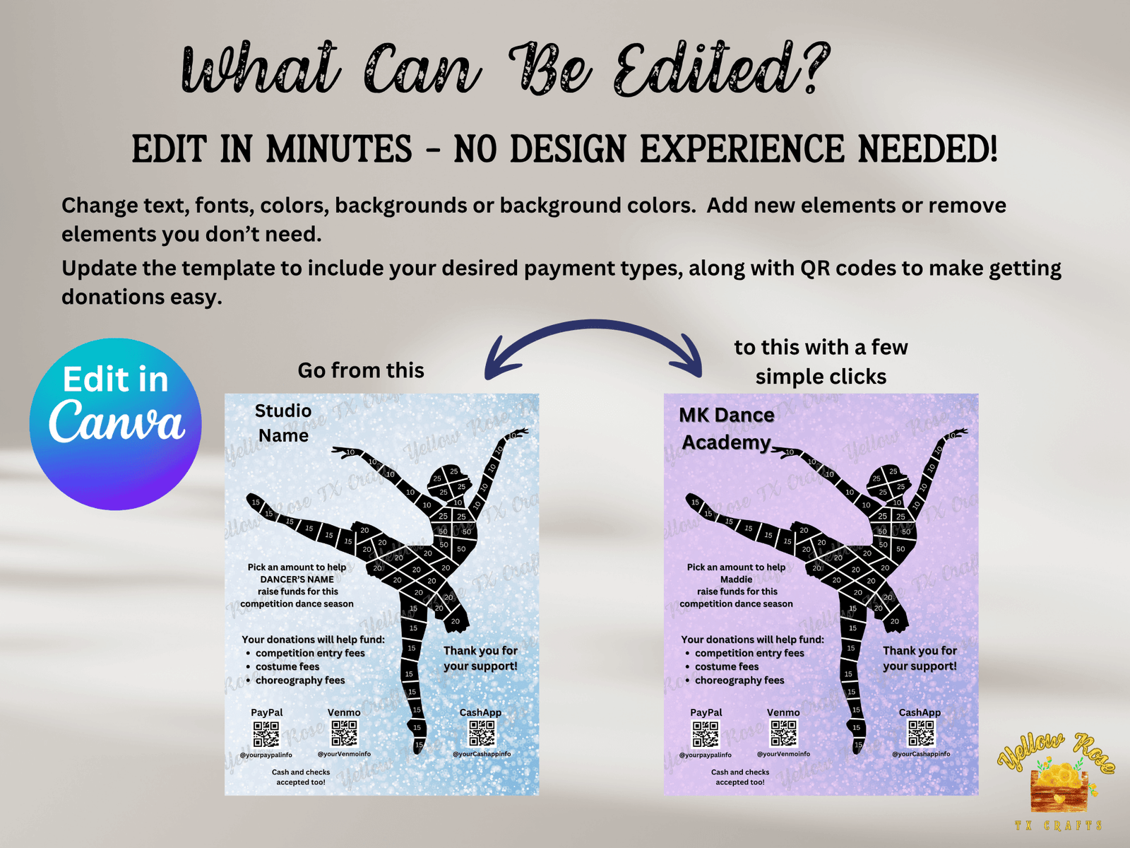 Designed to be easily editable, this template allows you to add your dancer’s name, studio information, and donation details with Canva — a free and user-friendly online tool. No software or extra fonts required! You can quickly edit, save, and download your flyer to print at home, send to a local print shop, or share digitally.