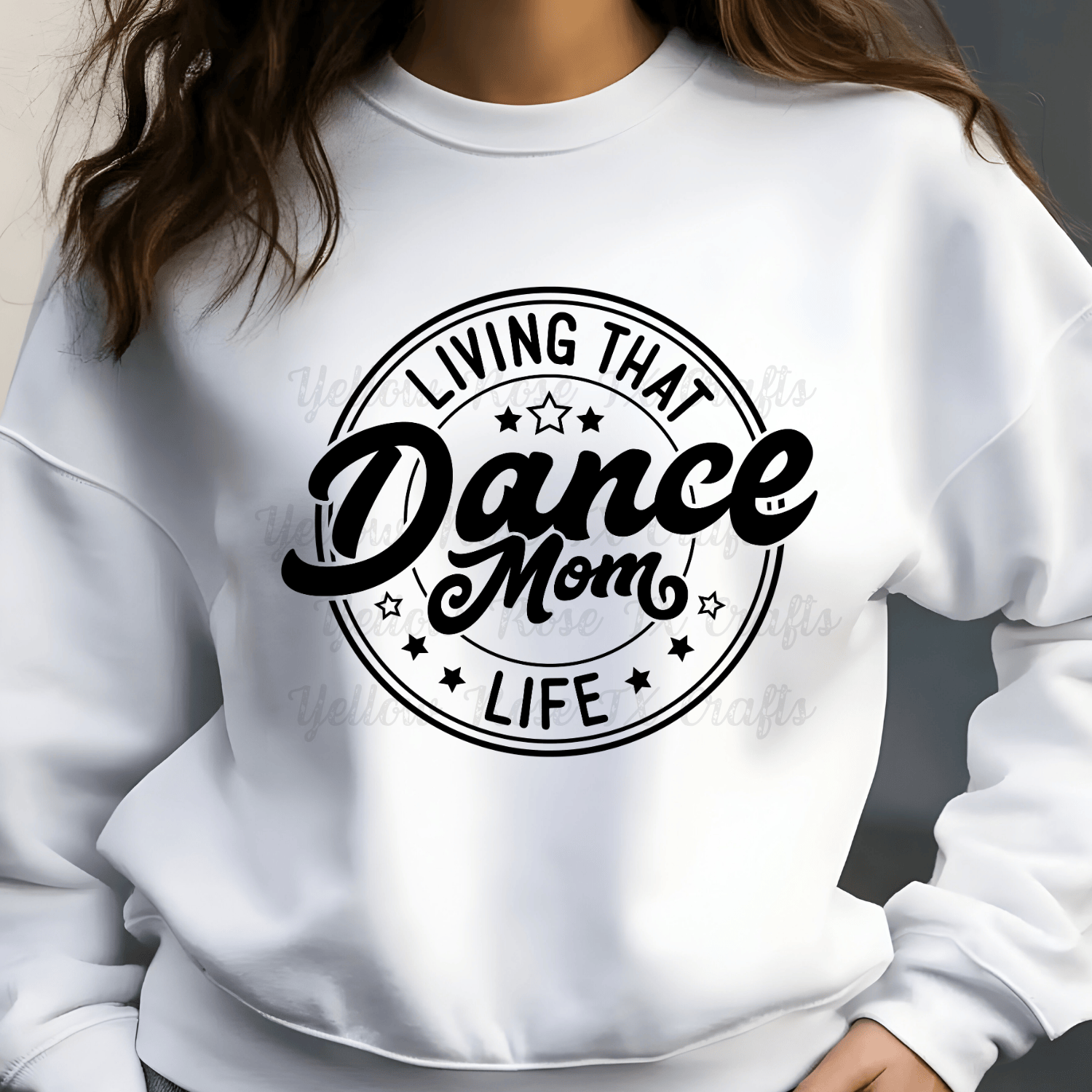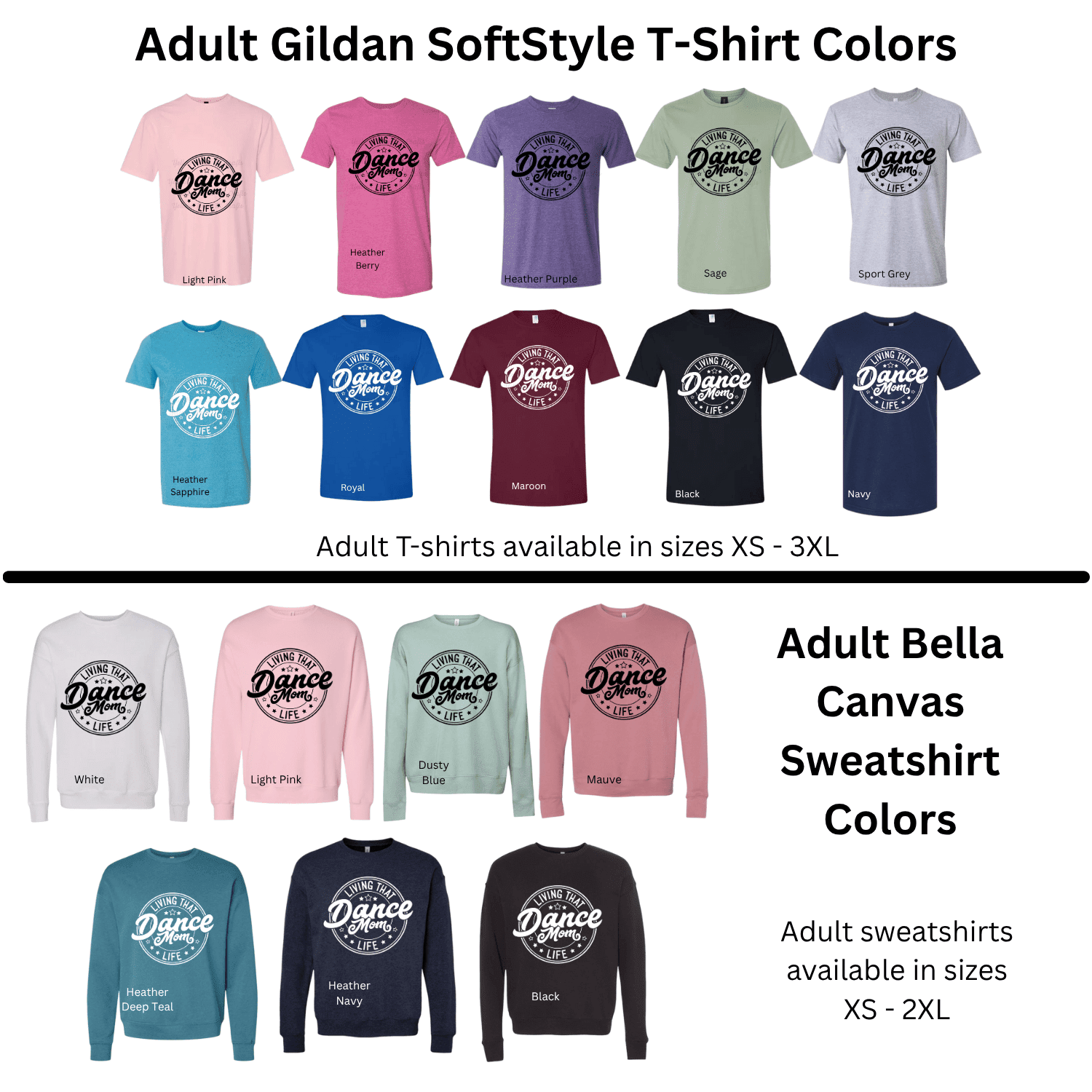 Show off your dance mom spirit with our “Living That Dance Mom Life” T-Shirt or Sweatshirt! Perfect for those who spend their days cheering at competitions, running to rehearsals, and supporting their dancers every step of the way. This shirt is a must-have for any proud dance mom!