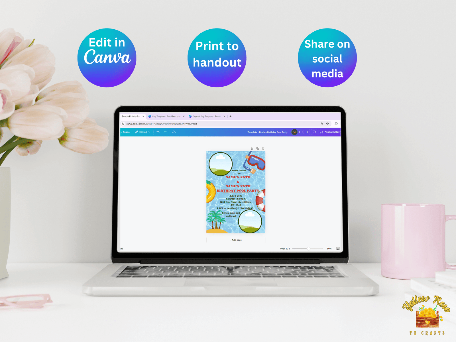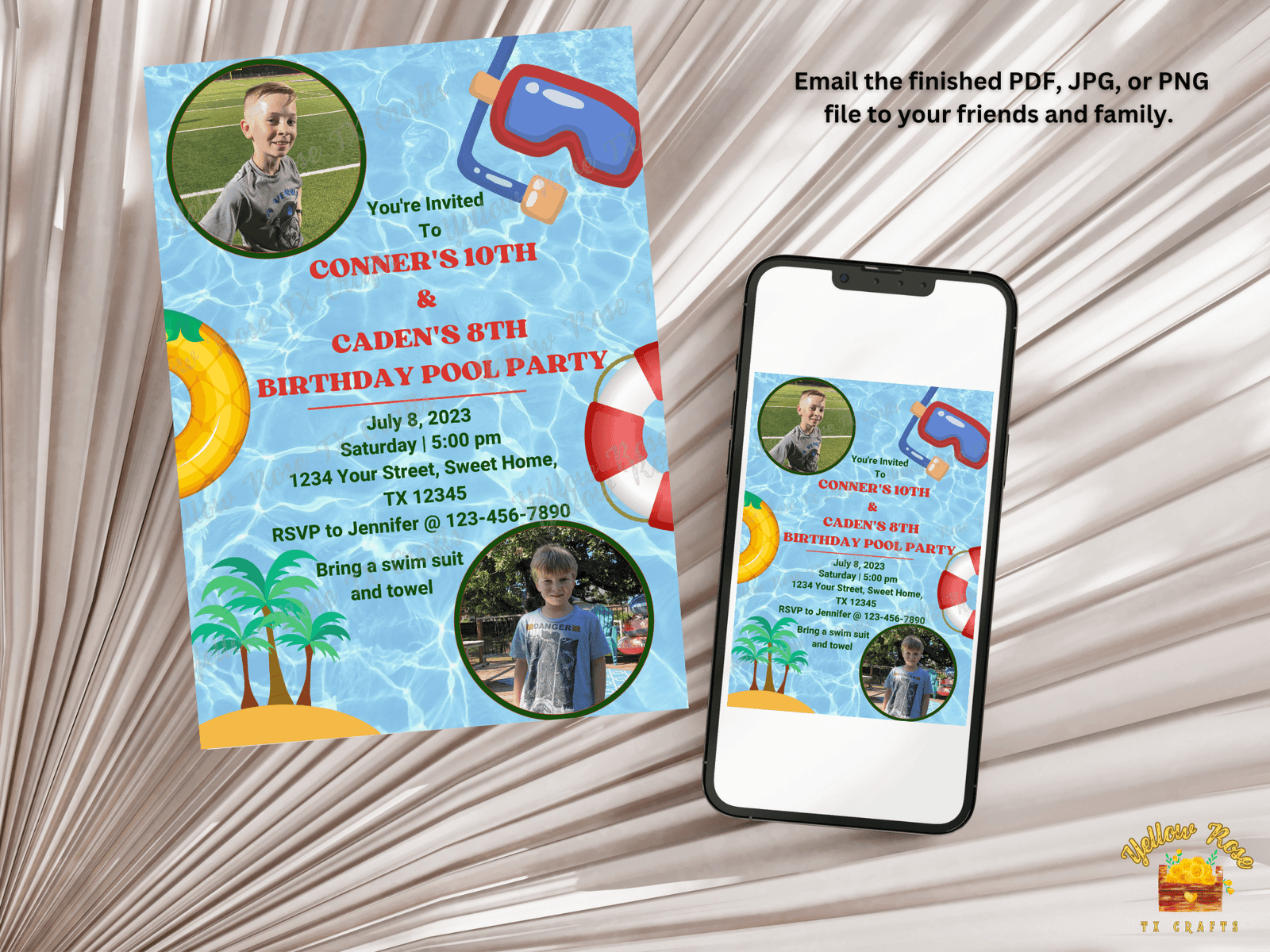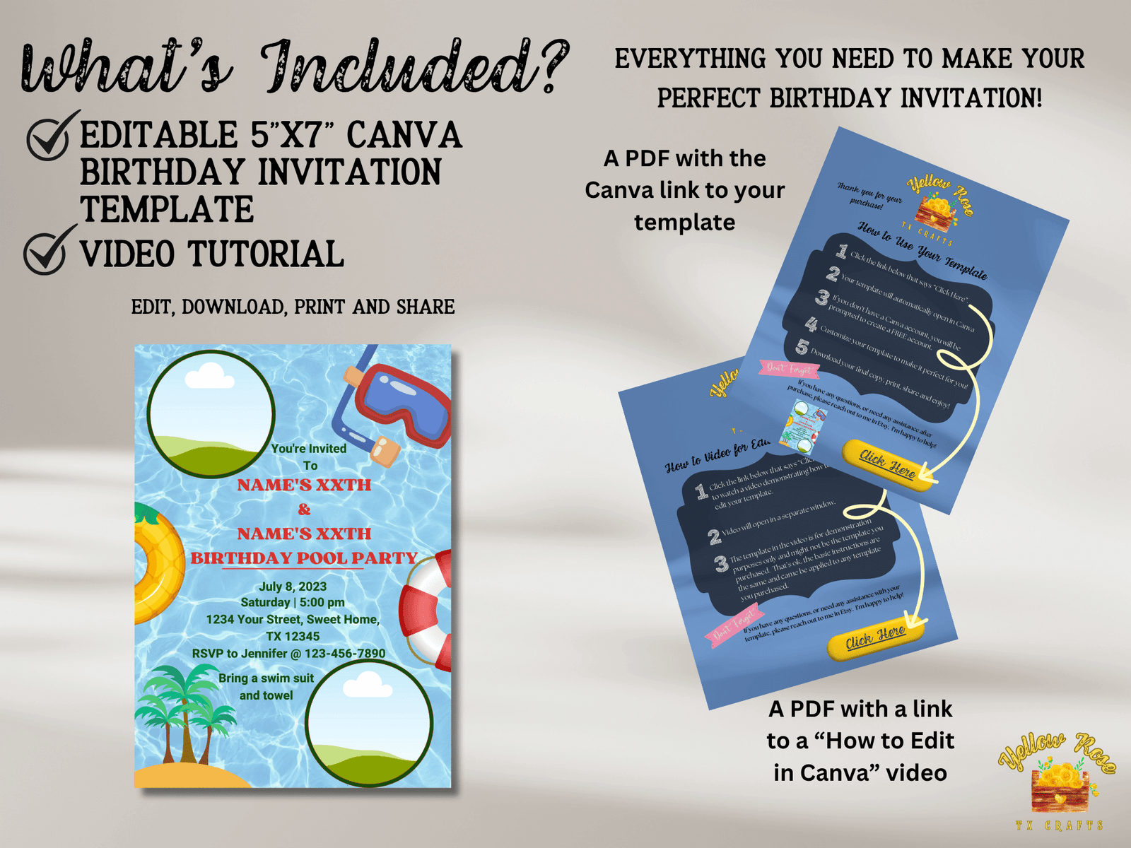 – A PDF with a link to your 5 in wide x 7 in tall Double Birthday Pool Party Invitation template
