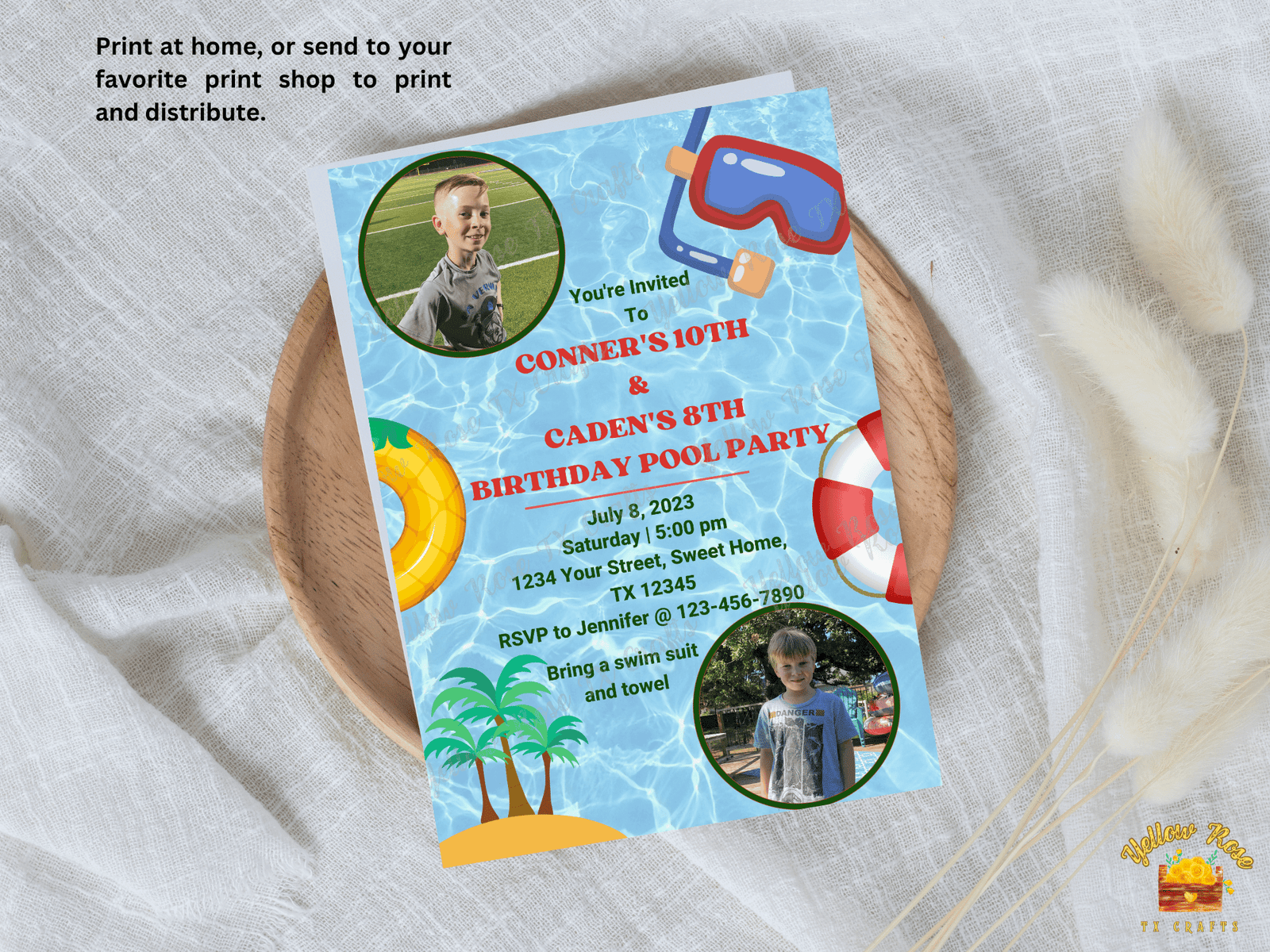 Double Birthday Pool Party Digital Invitation Template | 5×7 Canva Editable