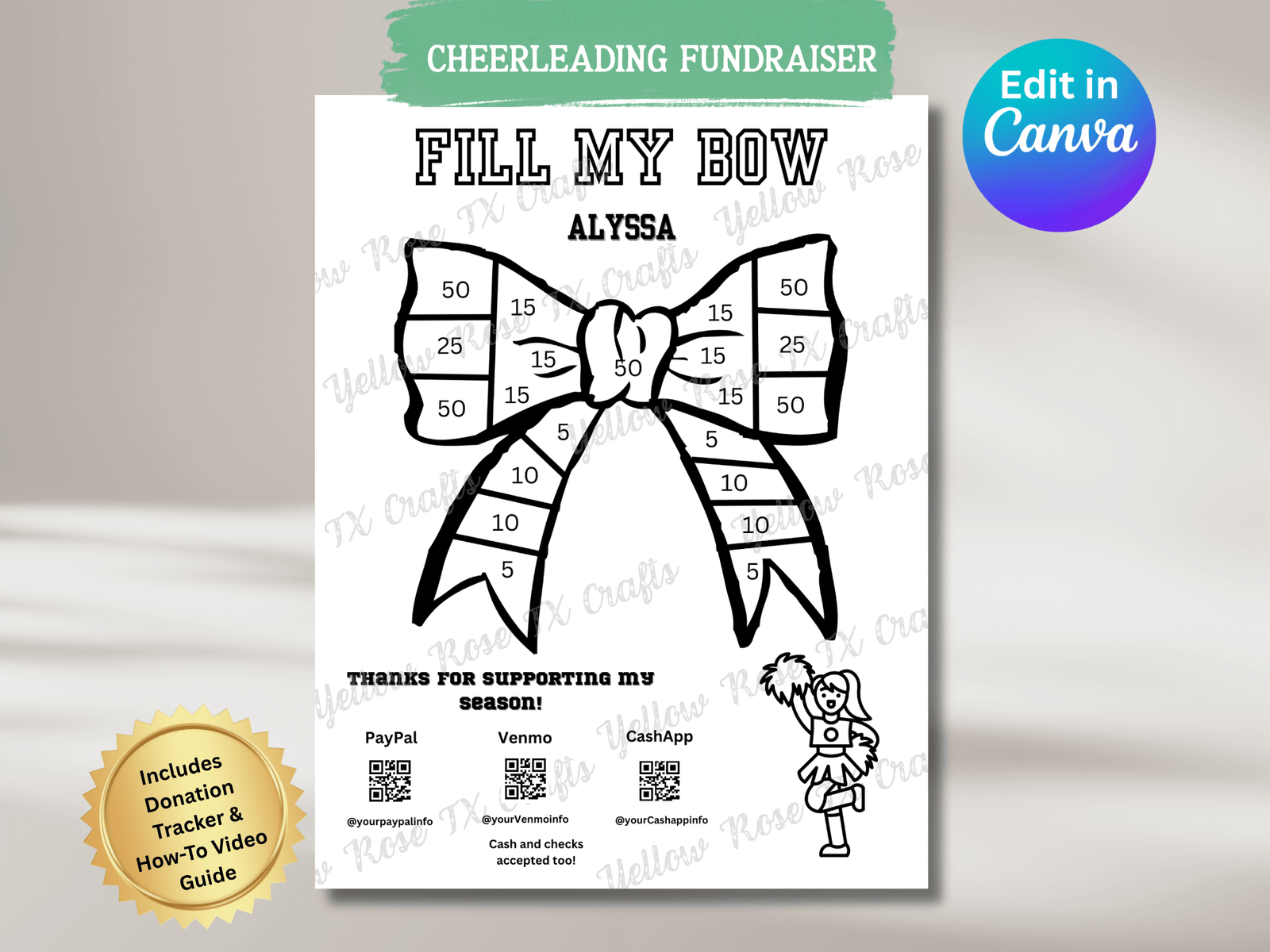 This template is ideal for cheer competition bow fundraisers, and is perfect for creating stunning fundraiser printables that draw in attention and support.