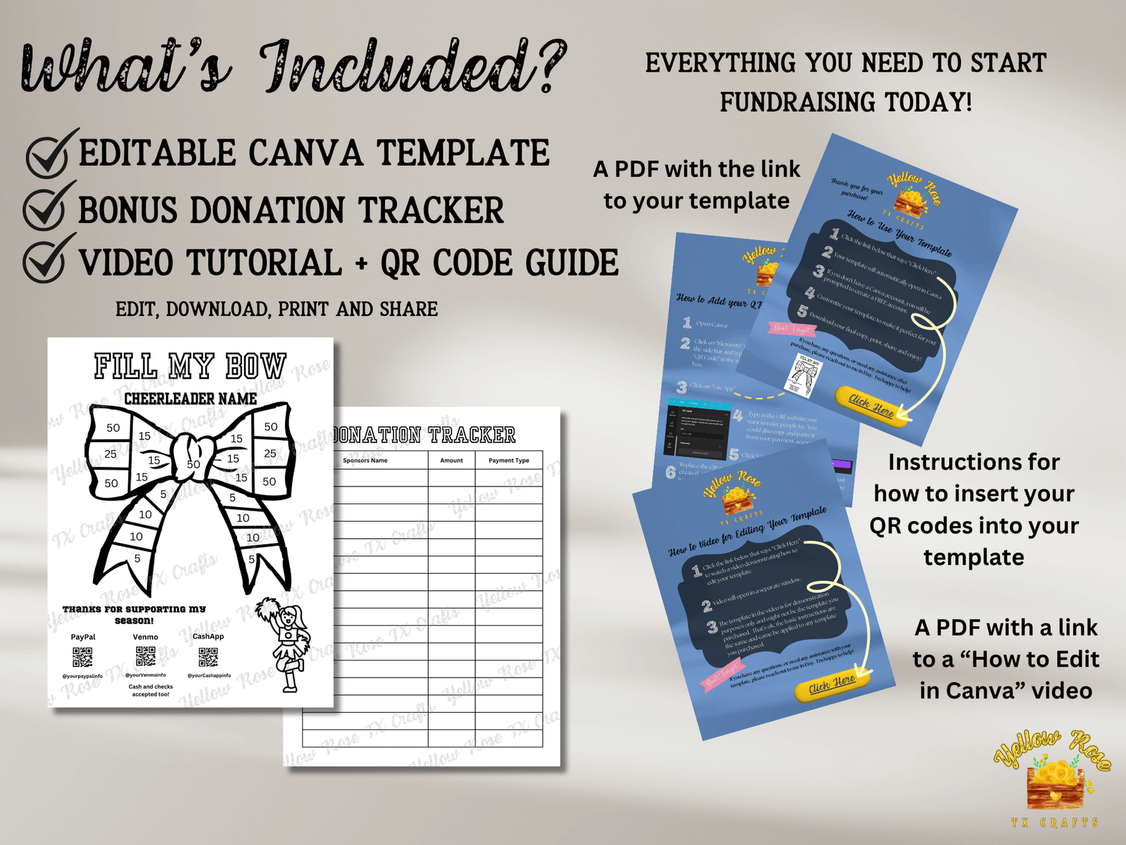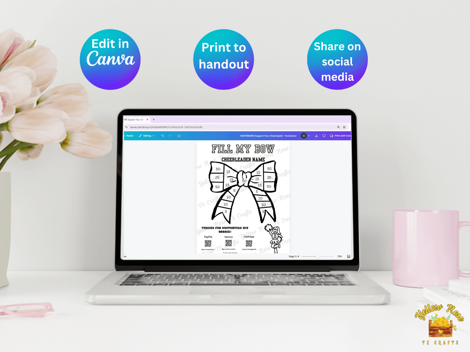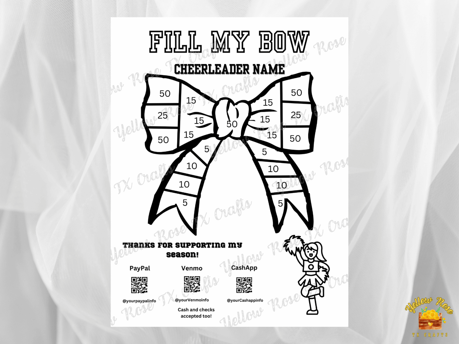 – A PDF with a link to your 8.5″ × 11″ Help My Cheerleader Fill My Bow Fundraiser Flyer Template