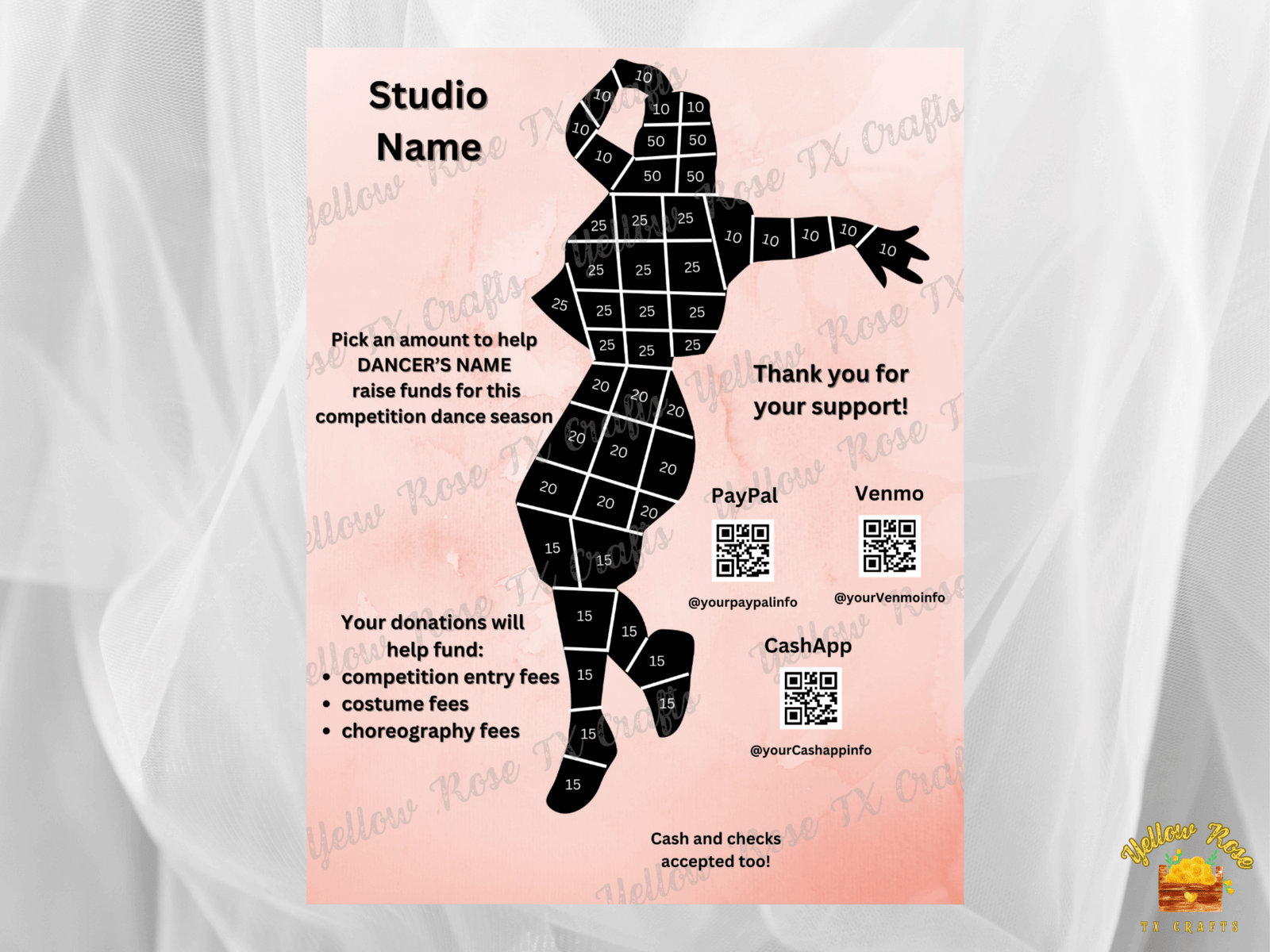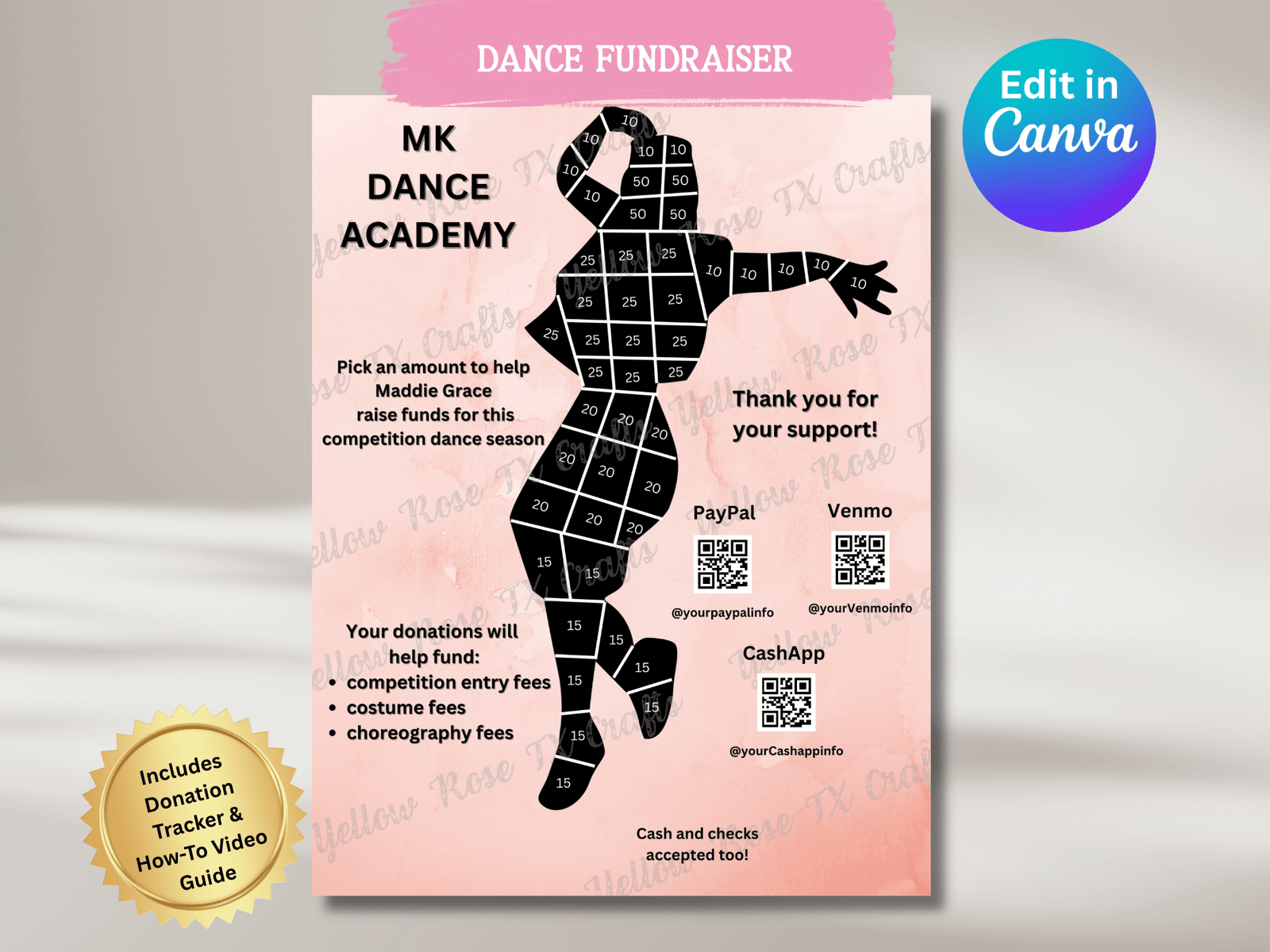 Share your customized flyer on social media to boost visibility and donations for your dancer. Thank you for choosing our template to support your fundraising journey!