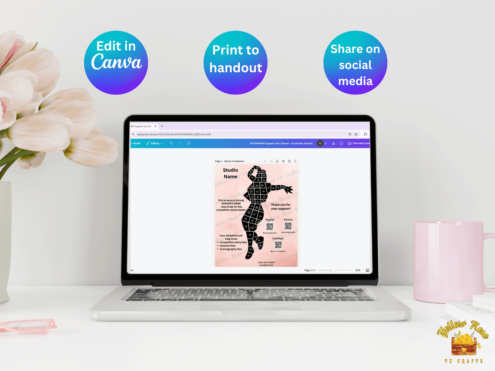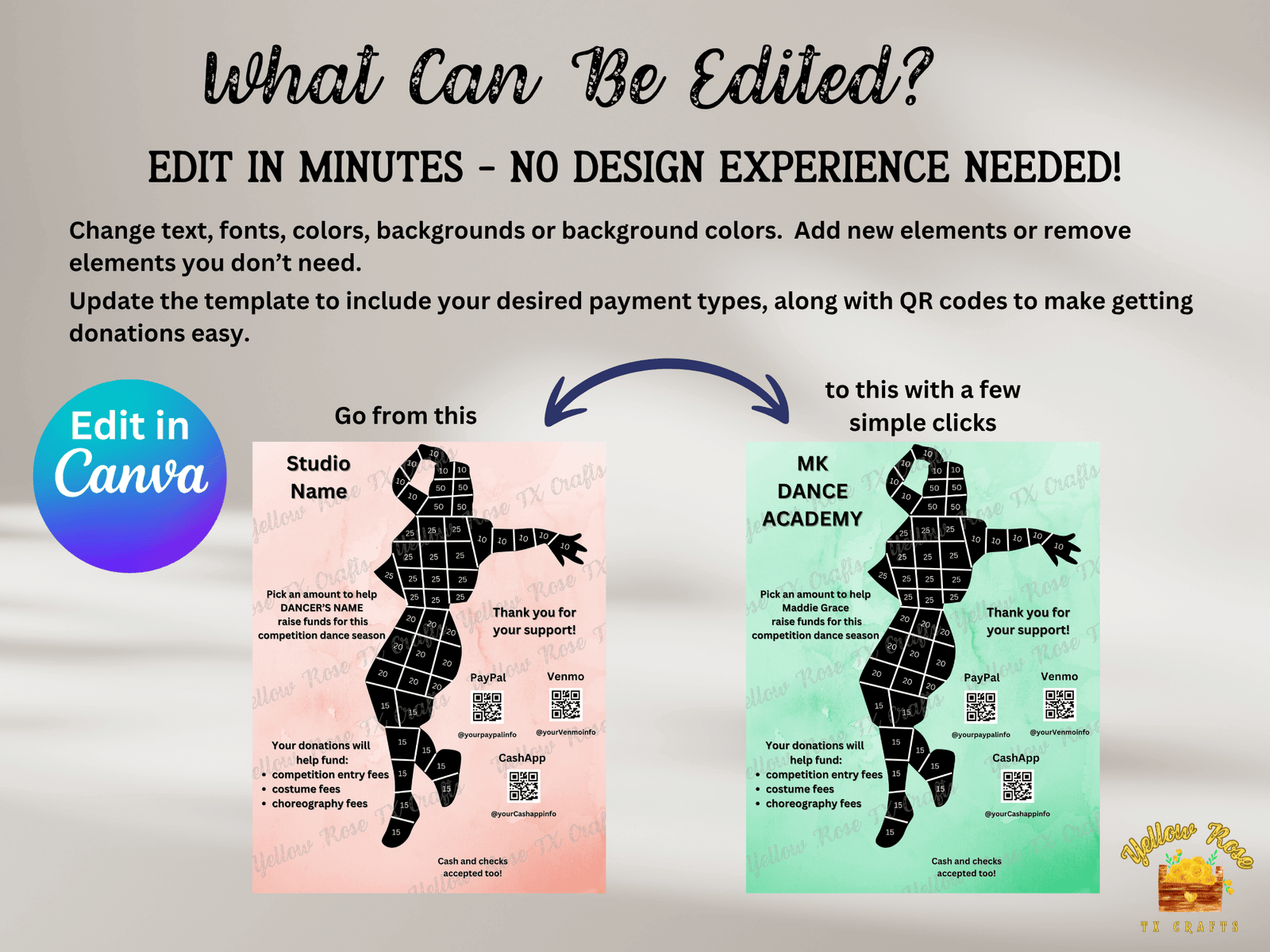 Designed to be easily editable, this template allows you to add your dancer’s name, studio information, and donation details with Canva — a free and user-friendly online tool. No software or extra fonts required! You can quickly edit, save, and download your flyer to print at home, send to a local print shop, or share digitally.