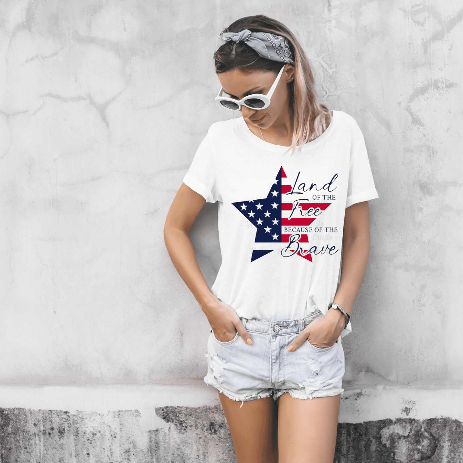 Show your pride in the red, white, and blue with our Land of the Free Shirt. This patriotic tee features a bold American flag star design and elegant script lettering — a timeless tribute to those who serve and protect our freedom. Perfect for Memorial Day, Independence Day, Veterans Day, or any day you want to celebrate your love for America.