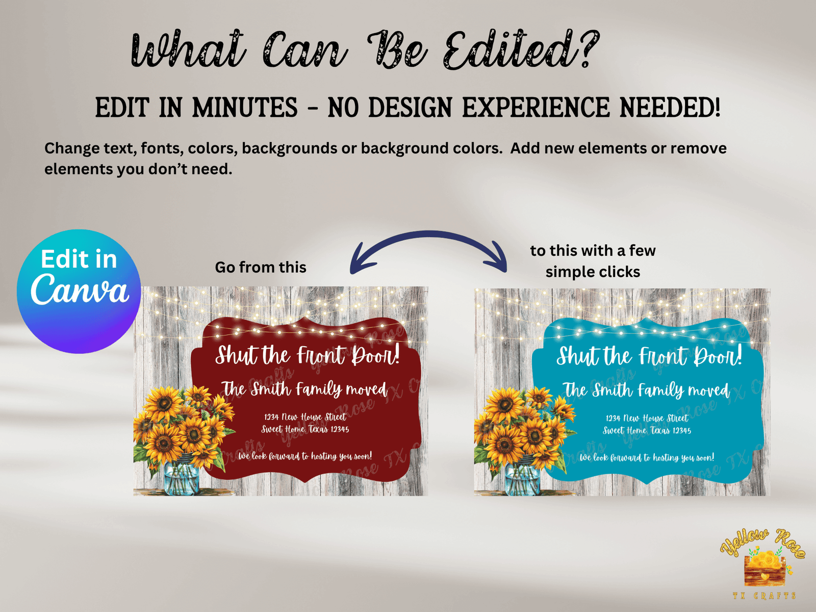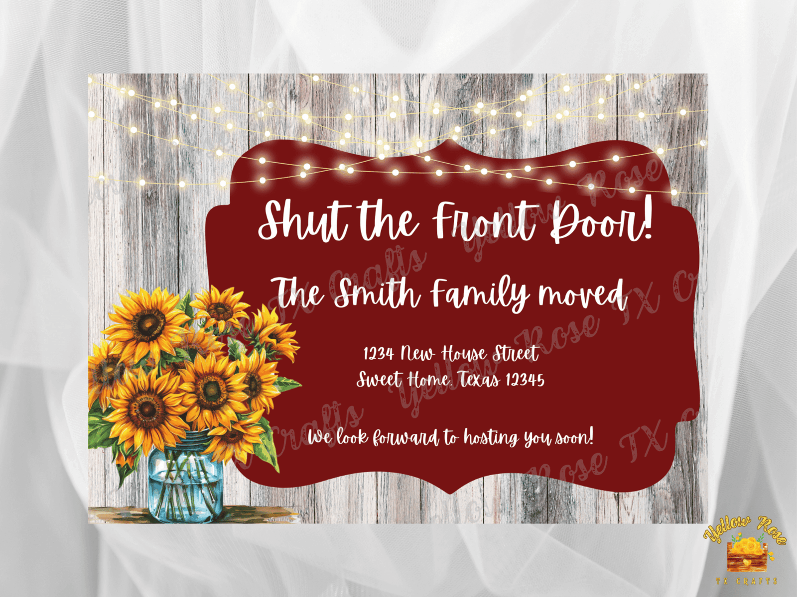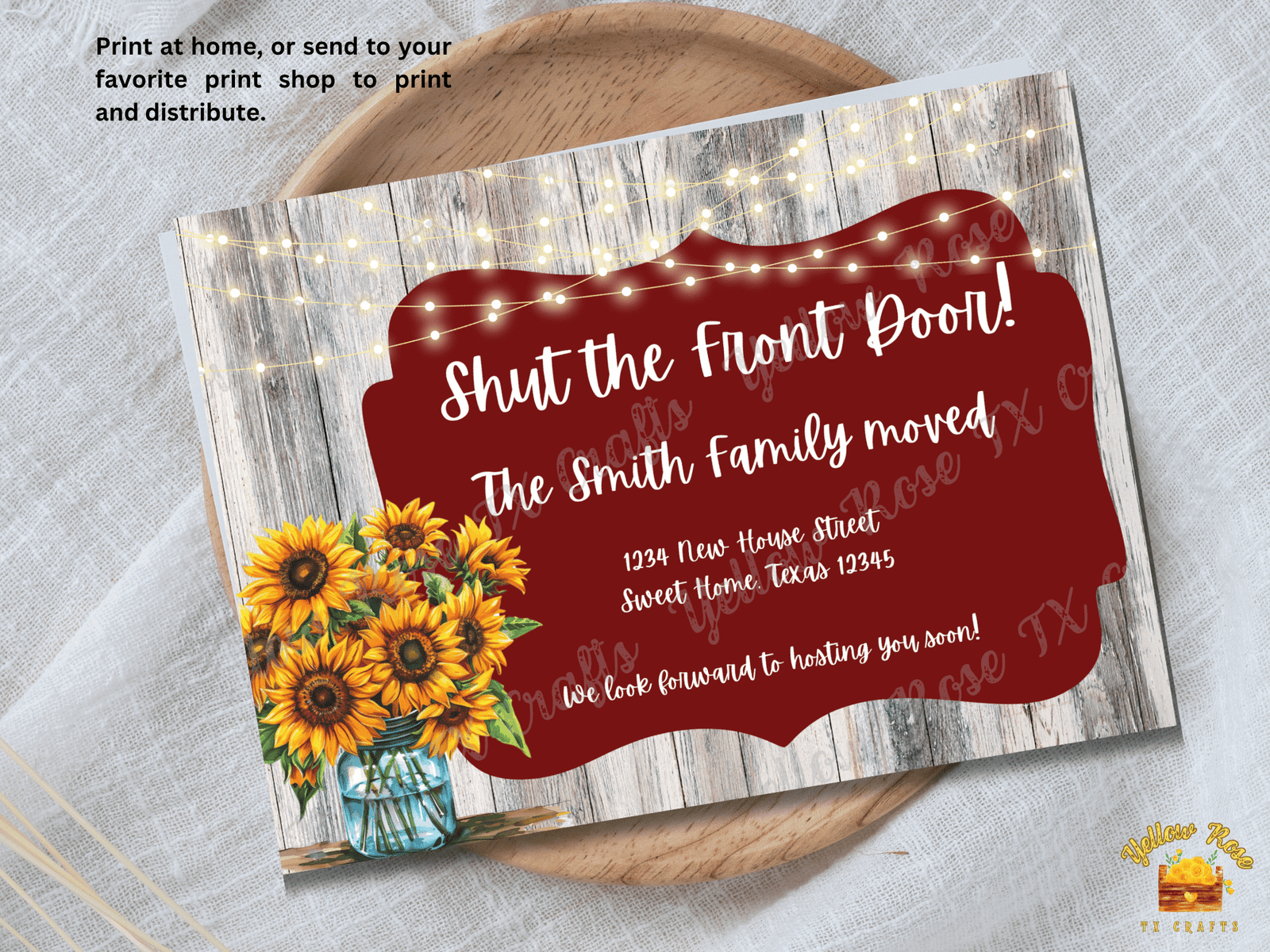 Celebrate your new beginnings with our beautifully designed “Shut The Front Door!” digital announcement template! This 7×5-inch landscape orientation card is perfect for sharing your exciting move with friends and family in style. Featuring a charming sunflower bouquet and rustic wood background, this template is fully customizable in Canva—no need to download any software or purchase fonts.
