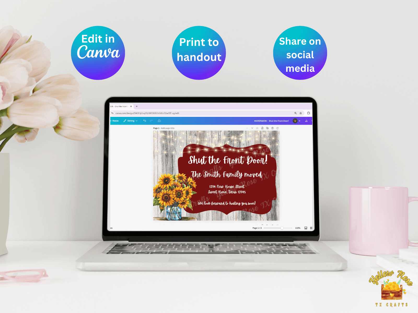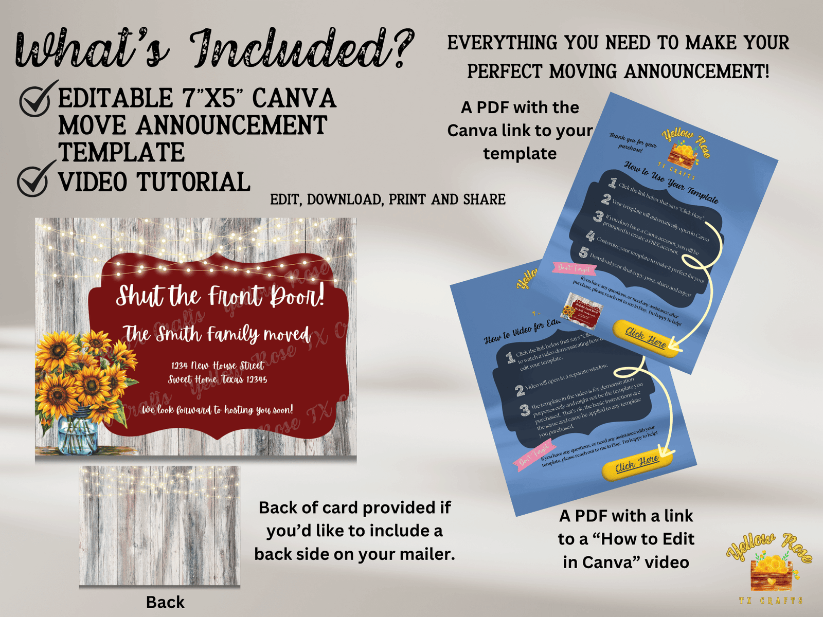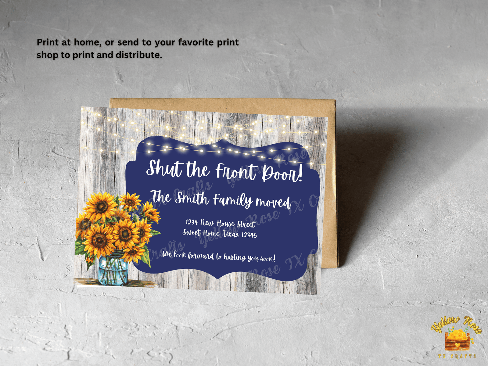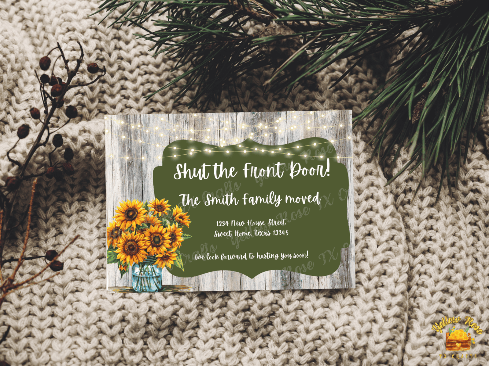 Celebrate your new beginnings with our beautifully designed “Shut The Front Door!” digital announcement template! This 7×5-inch landscape orientation card is perfect for sharing your exciting move with friends and family in style. Featuring a charming sunflower bouquet and rustic wood background, this template is fully customizable in Canva—no need to download any software or purchase fonts.