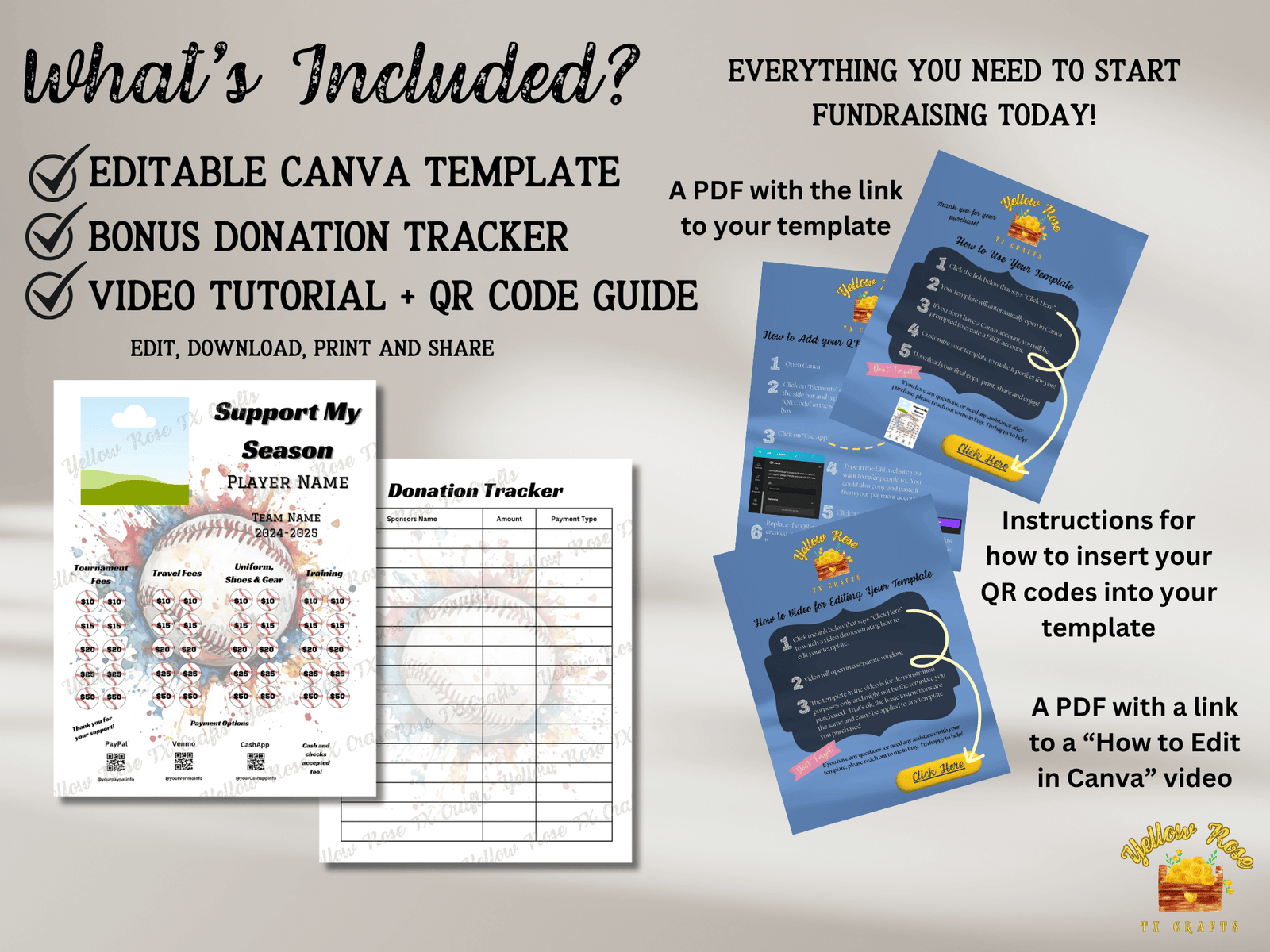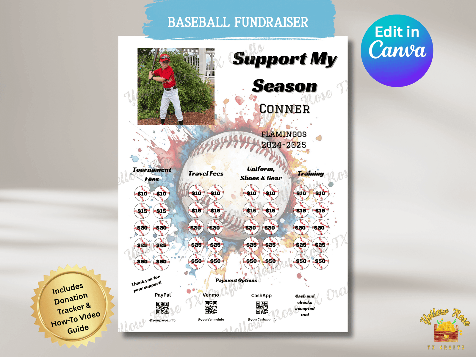 ✨ Editable Baseball Fundraiser Template: Personalize it with your name, team info, and donation categories and amounts in minutes using Canva. No design skills needed!